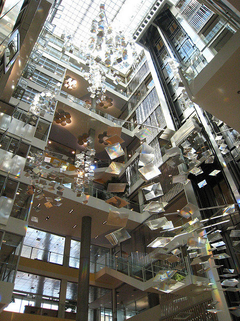A vast skylit atrium encourages the creation of an interactive environment, invigorated through a series of pedestrian bridges that join the floor levels and functions. -- architect's web site